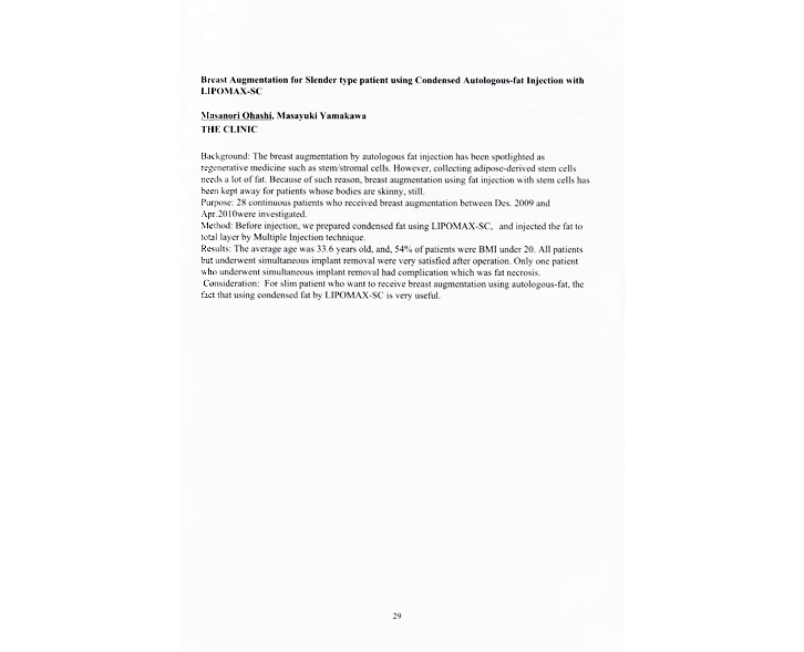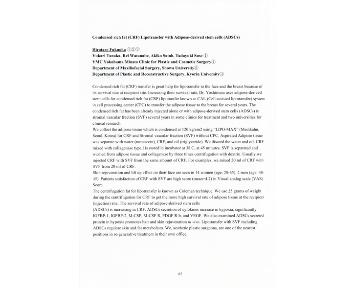 2010年6月、東京にて第98回日本美容外科学会が開催され、全国各地から美容外科のドクターが集まりました。その中でコンデンスリッチファットを用いた脂肪注入について、2つのテーマで発表がされましたので、ご紹介します。